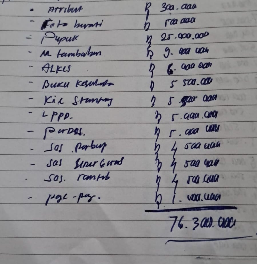 Atribut Rp 300.000,Foto Bupati Rp 500.000,pupuk Rp 25.000.000,makanan tambahan Rp 9.000.000, alkes Rp 6.000.000,buku kesehatan Rp 5.500.000,Stunting Rp 5.500.000,LPPD Rp 5.000.000,PERDES Rp 5.000.000,sosialisasi Perbub Rp 4.500.000,sosialisasi sinergitas Rp 4.500.000 ,sosialisasi rantib Rp 4.500.000. dan pege pege Rp 1.000.000.(ds/edy)
