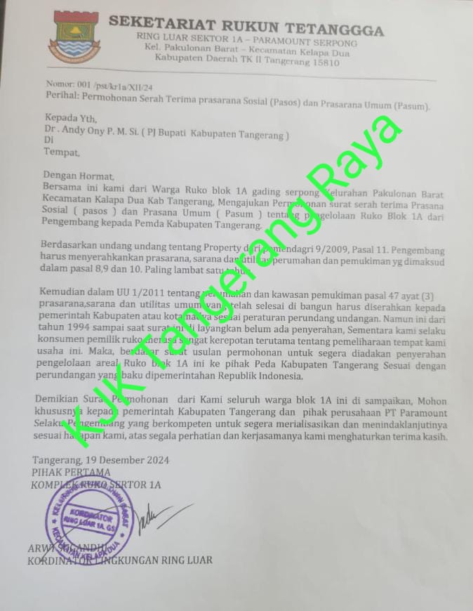 Arwil Sugandhi Ketua Koordinator Ring Luar Blok 1A Paramount, mengatakan. Pihaknya merasa kecewa, keberatan dengan keputusan secara sepihak. Pasal pihak perusahaan tidak mengundang kita dan terbitlah surat dari Badan Pengelola Keuangan dan Aset Daerah yang di ketahui dan tanda tangan oleh Oknum ARH Aparat Sipil Negeri (ASN).