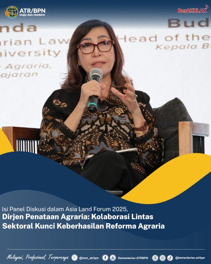 “Tentunya Reforma Agraria ini bukan menjadi pekerjaan rumahnya ATR/BPN saja, jadi Kementerian ATR/BPN itu sangat membutuhkan dukungan, sinergi, dan kolaborasi kementerian atau lembaga lintas sektoral. Semua _stakeholder_ terkait harus bekerja sama, bukan hanya sama-sama bekerja,” ujar Yulia Jaya Nirmawati saat menjadi narasumber dalam Panel Diskusi pada Asia Land Forum 2025 yang berlangsung di Mercure Jakarta Batavia, Rabu (19/02/2025).