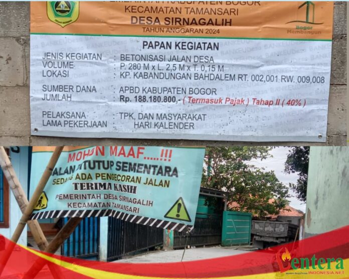 Betonisasi jalan Desa yang berlokasi di Kp. Kabandungan, RT. 002, 001/ RW. 009 dan RW. 008 , Desa Sirnagalih, Kecamatan Tamansari, Kabupaten Bogor, dengan volume kegiatan P. 280 m x L. 2,5 m x T. 0.15 m, dengan anggaran Rp. 188.180.800,- yang bersumber dari Anggaran APBD Kabupaten Bogor Tahun 2024.