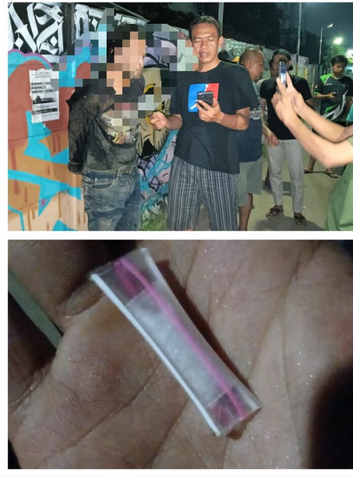 Diketahui laki-laki tersebut sedang melakukan narkotika jenis sabu dengan sistem tempel. Atas kejadian tersebut, saksi mengamankan pelaku beserta Barang bukti yang berhasil diamakan ialah 1 (satu) paket bungkus kecil diduga sabu,1 (satu) unit sepedea motor, 1 (satu) buah handphone.
