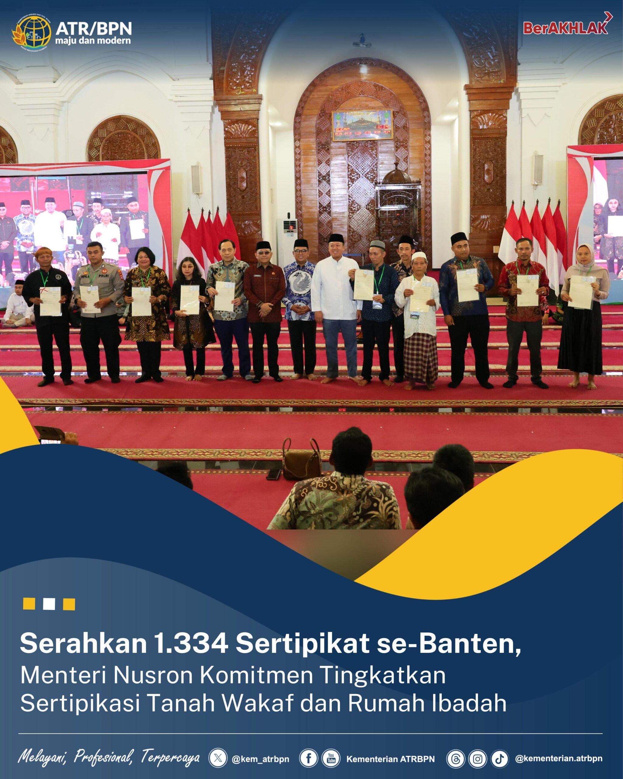 “Yang paling penting ini supaya sertipikat wakaf mohon segera ditingkatkan karena wakaf ini aset umat, harus diselamatkan. Karena itu, saya sudah perintahkan Pak Kepala Kanwil dan Pak Kepala Kantah, salah satu bagian dari kinerja kantor adalah mempercepat dan memperbanyak sertipikasi tanah wakaf, gratis!” kata Nusron Wahid usai menyerahkan sertipikat di Masjid Raya Al-Bantani yang berada di Kawasan Pusat Perkantoran Pemerintah Provinsi Banten (KP3B), Kota Serang, Provinsi Banten.